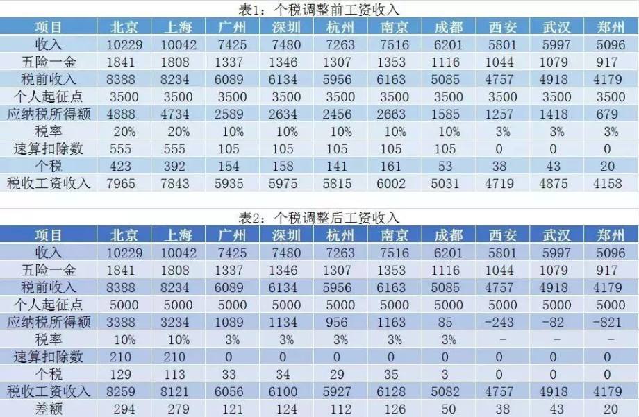 个税到底降了多少,我们通过一张表来看看不同群体在个税调整前后的缴税变化: